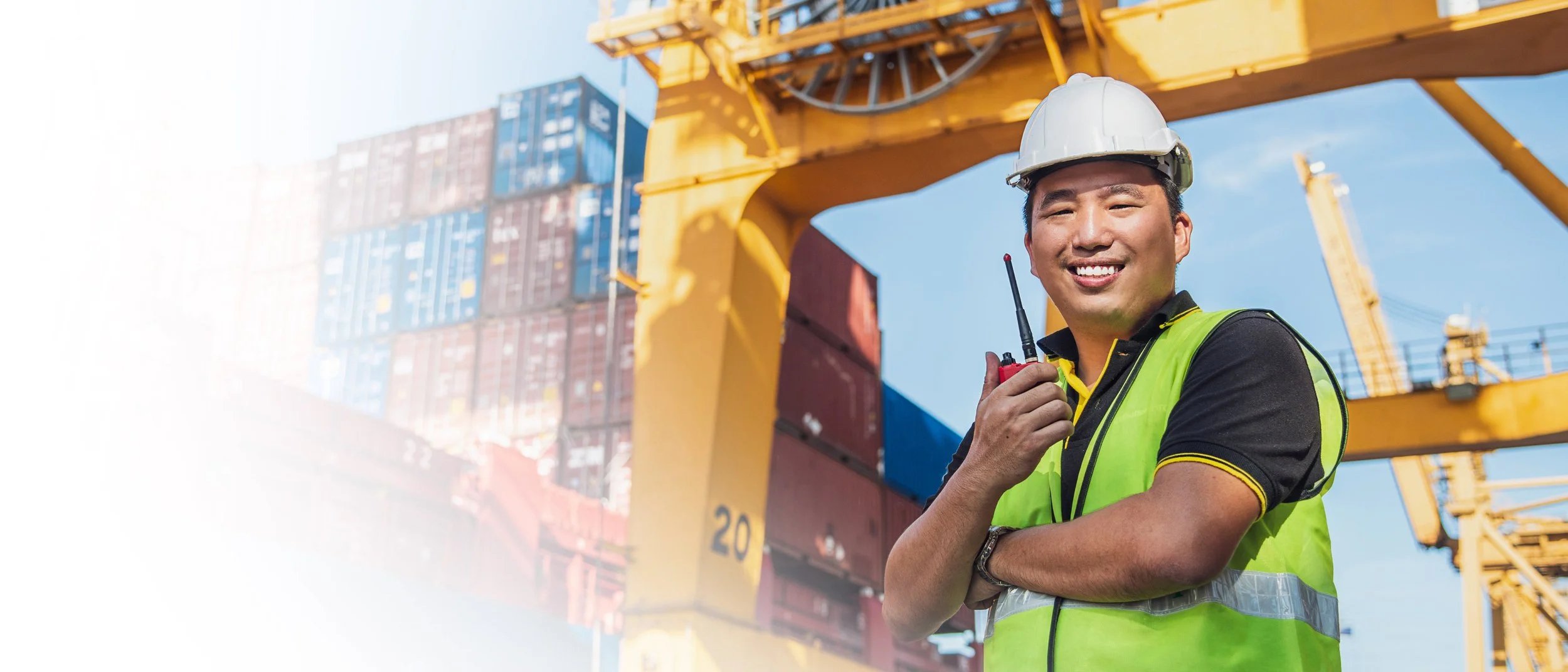 A smiling man in a safety vest and hard hat holding a walkie-talkie at a shipping port with stacked cargo containers and cranes in the background.